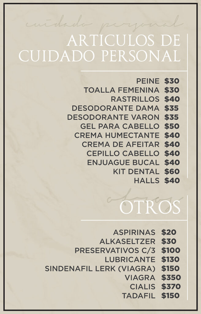 La tarifa del servicio del hospedaje queda establecida en los respectivos tarjetones que rigen en este establecimiento o que haya autorizado la Secretaria de Turismo, bien sea a través de un acuerdo de tipo general o de una autorización expresa. El pago podrá ser exigido por adelantado, a juicio de la empresa, el HUÉSPED podrá garantizar el pago al hotel mediante la firma de un pagare (voucher) de alguna tarjeta de crédito aceptada por el hotel. El pasajero que el día de su salida desocupe la habitación después de las TRECE horas establecidas en el articulo anterior, queda obligado el pago del precio del hospedaje correspondiente a otro día. La falta de pago por parte del HUÉSPED cuando sea requerido al efecto. Causa la recisión del servicio de hospedaje y el hotelero podrá hacer uso de la fuerza publica para exigir y llevar a cabo la desocupación, pudiendo retener el equipaje en garantía en los término previstos por el articulo 2669 del código civil para el D.F. o sus correlativos de los estados de la República.